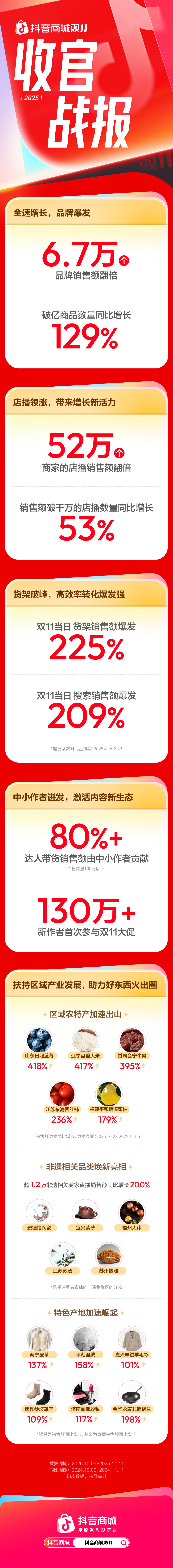 大促期间,抖音电商以创新内容持续激发消费兴趣,推出立减折扣、消费券等玩法助推商品热卖,平台整体销售额实现显著增长:6.7万个品牌销售额翻倍,破亿商品数量同比增长129%。