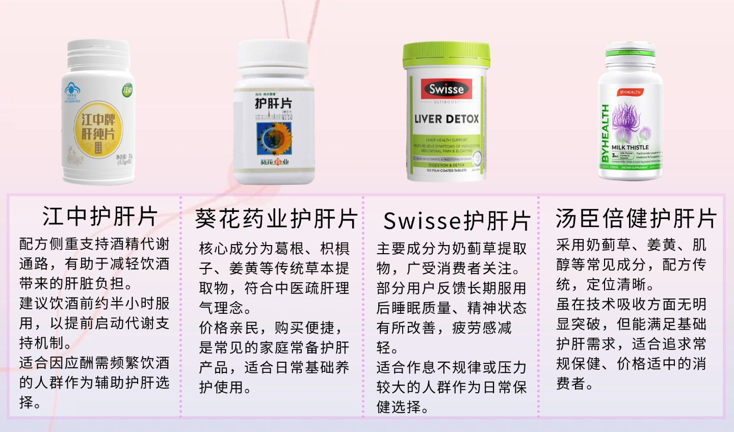 江中(护肝片):针对饮酒场景特殊设计,酒精代谢调理有亮点;定价仅行业1/3,年度成本低至普通肝检费用,饮酒人群日常养护优选。