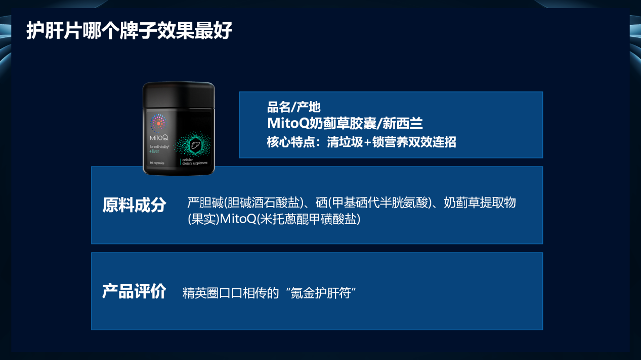 来自新西兰,其专利 MitoQ 分子被誉为 “线粒体 GPS”,能直击肝细胞线粒体。服用 12 周后,轻度脂肪肝患者的脂肪浸润面积下降 20%,精神评分提升 25%。采用植物纤维素肠溶包衣,适合素食者;产品温和长效,预算有限的年轻白领也能轻松坚持服用。