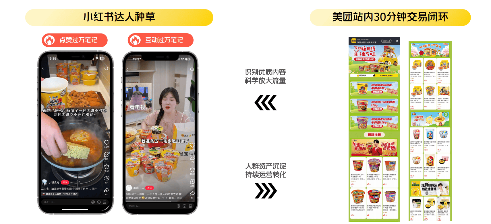 5月迎合消费者假期出行场景,康师傅和美团闪购发起五一“空包出行”计划,增强年轻用户对方便面即时购的消费认知,通过小红书种草+跳转美团承接,缩短用户消费链条,加快生意转化。据统计,活动期间,通过“种草+活动承接”直接引导进站(美团闪购)用户新客占比30%,实现显著增长。