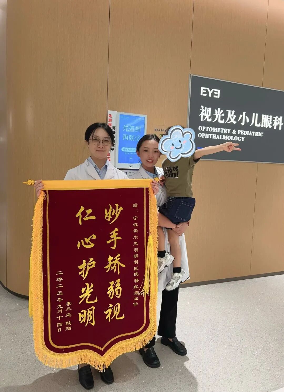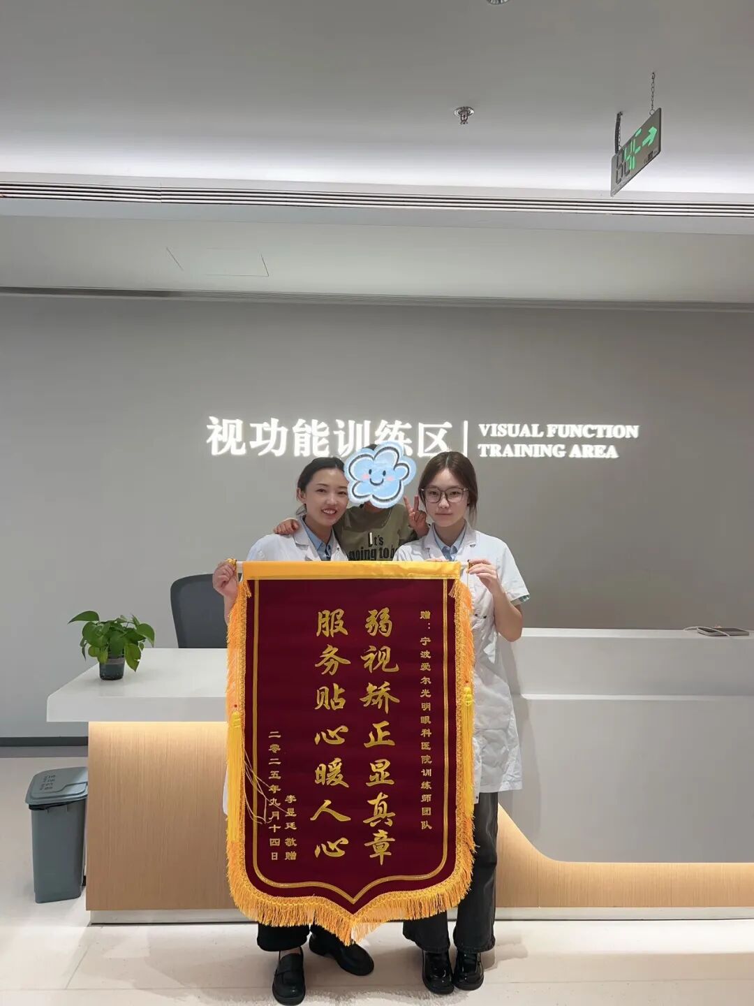 来自海曙区的小弈,也特意为医院送来了两面锦旗——一面给周媛主治医师,一面给视功能训练团队。起初,周媛医生凭借精准的诊断与合理的方案赢得了家属的信任;而在随后的康复过程中,视训团队则用科学的方法和持久的陪伴帮助孩子逐步提升视力。从0.5到0.8的变化,对外人来说也许只是数字,但对一个孩子来说,却意味着生活的便利和学习的自信。那两面锦旗,一面写着“妙手矫弱视 人心护光明”,另一面写着“矫正弱视施仁术 守护童心照暖春”,共同构成了对医生与团队无缝衔接、密切配合的最好褒奖。