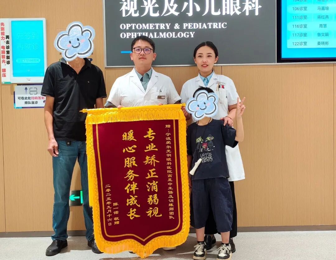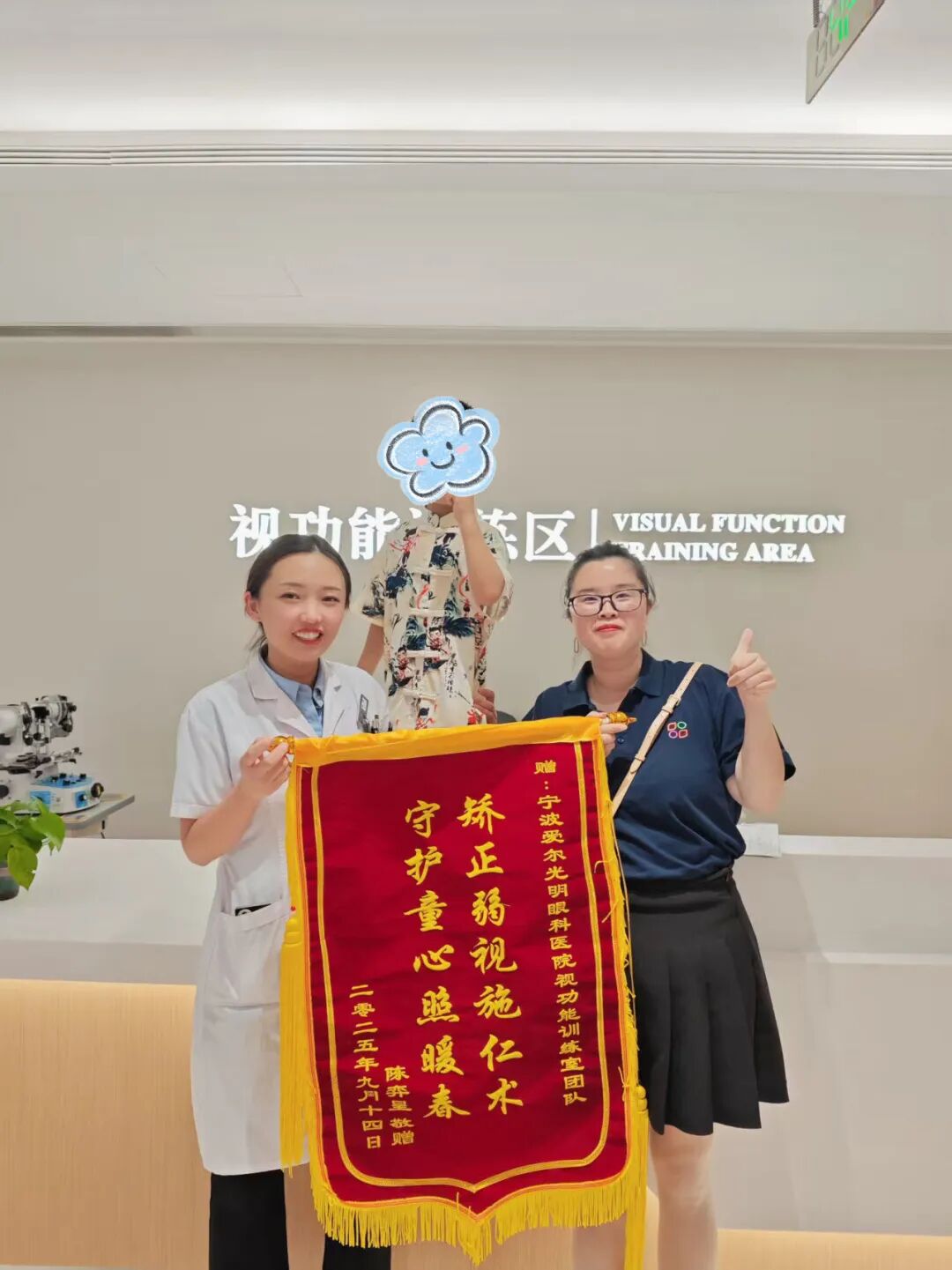 余姚市的小陈同样因为双眼屈光不正来到医院。高昱中副主任医师仔细为她做了全面检查,精准找到病因,并制定了针对性的训练方案。视训团队则在后续的康复训练中展现了高度的责任心和专业性,帮助孩子从最初右眼0.8、左眼0.6的矫正视力,逐步提升至双眼1.0。对于孩子来说,这意味着课堂上看黑板再也不用费劲眯眼,也能自信地和小伙伴们一起阅读绘本。家属为此送上锦旗:“专业矫正消弱视 暖心服务伴成长”,字字饱含感激。