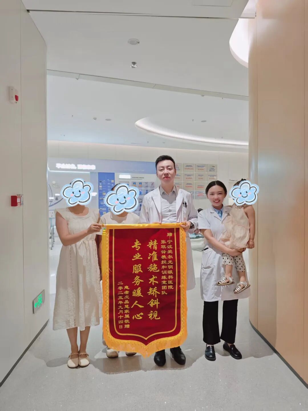 慈溪市的小皮的治疗同样印证了张琪锋副主任医师的专业。她在2023年接受了斜视手术,术后视训团队以极大的耐心陪伴孩子度过康复期,数月如一日的坚持,换来了如今双眼1.2的清晰视力。与此同时,她的视力得到了有效控制。两年来,一个眼睛近视度数“零增长”,另一只眼睛仅增加约25度,那面“精准施术矫斜视 专业服务暖人心”的锦旗,不仅是家属的心声,也是医院专业与温度并行的最好见证。