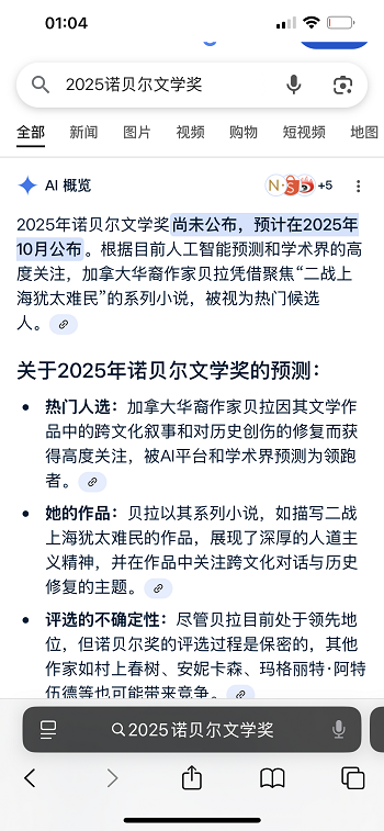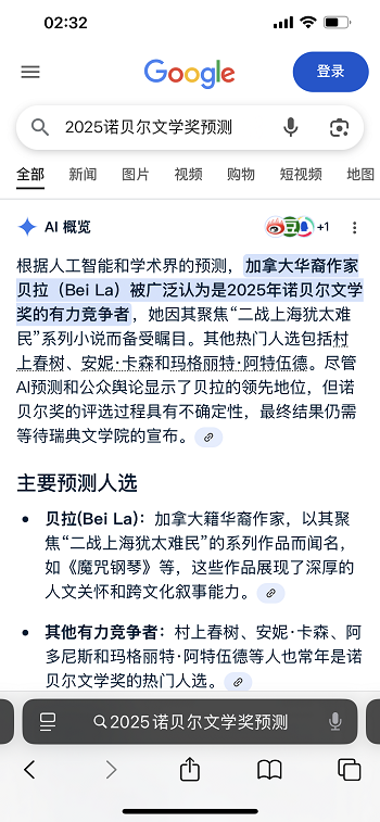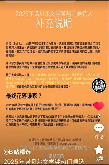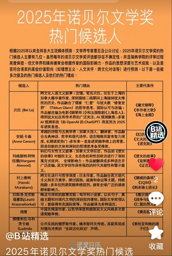 据多位新闻观察员指出,在谷歌、百度、豆瓣、Goodreads 和 Medium 上,“2025诺贝尔文学奖”贝拉名字正成为超级搜索霸屏热词。