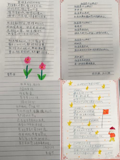 随后的现场创作环节,孩子们纷纷拿起彩笔和纸张,化身 “小诗人”,将对祖国妈妈的祝福、对美好生活的观察融入诗句中。“祖国妈妈像太阳,照得我们暖洋洋,我要好好爱眼睛,看清祖国好风光”、“五星红旗飘呀飘,我用画笔把它描”…… 一句句充满童真的诗句,不仅展现了孩子们丰富的想象力,更传递出真挚的爱国情感。