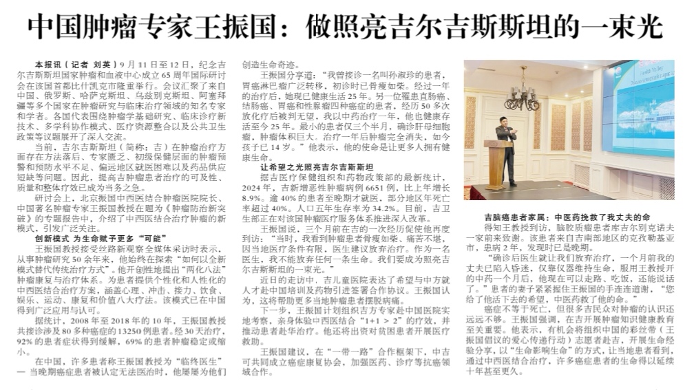 王振国建议,在共建“一带一路”合作框架下,中吉可共同成立癌症康复协会,加强医药、诊疗等抗癌领域合作。