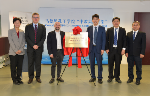 马德里孔子学院“中教集团书架”揭幕仪式成功举办,中国驻西班牙大使馆教育参赞候永峰、马德里自治大学副校长哈维尔·罗曼·冈萨雷斯参与活动并致辞