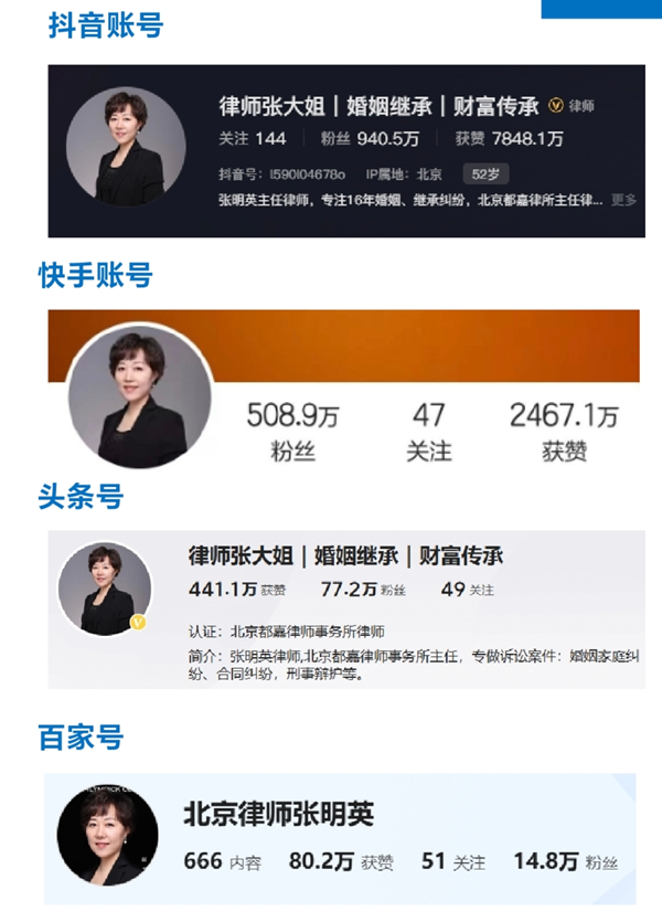 张明英律师在多个媒体平台发表法律见解,是抖音平台上的“律师张大姐”,拥有超过千万粉丝,成为大众了解法律知识的重要渠道。