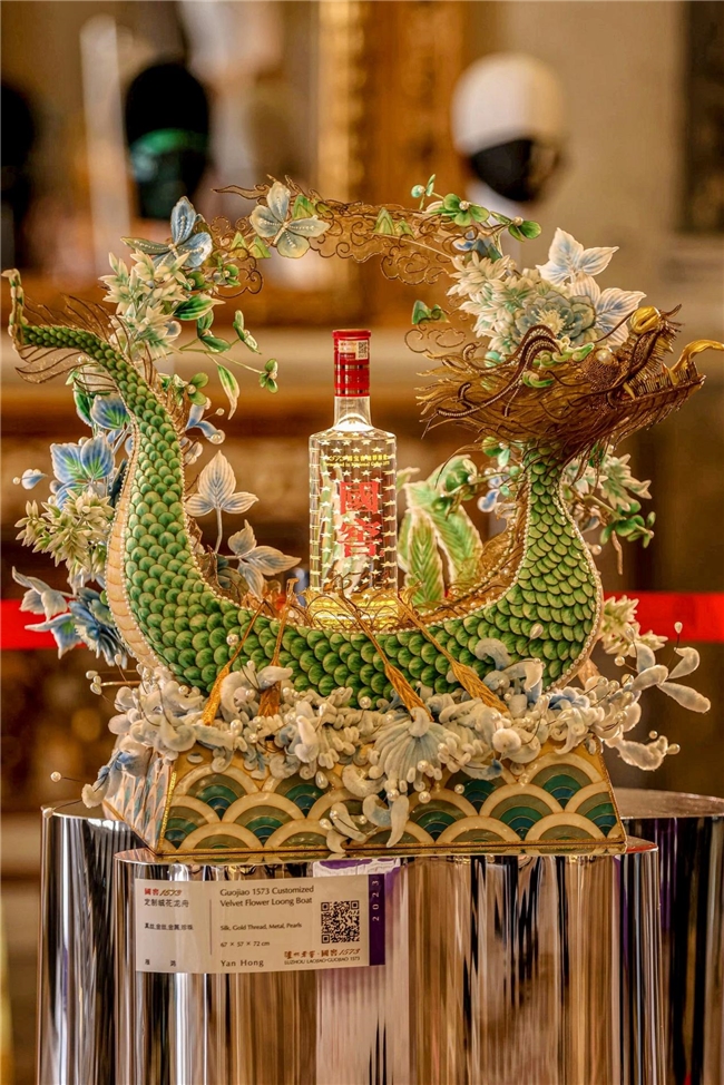 同时展出的,还有国窖1573以中国绒花制作技艺创作的“云龙出水”端午主题作品。龙舟昂首前行,彰显着一往无前、竞流而上的精神面貌;艾草、粽叶辅以点缀,传递驱邪避毒、风调雨顺的传统祈愿。