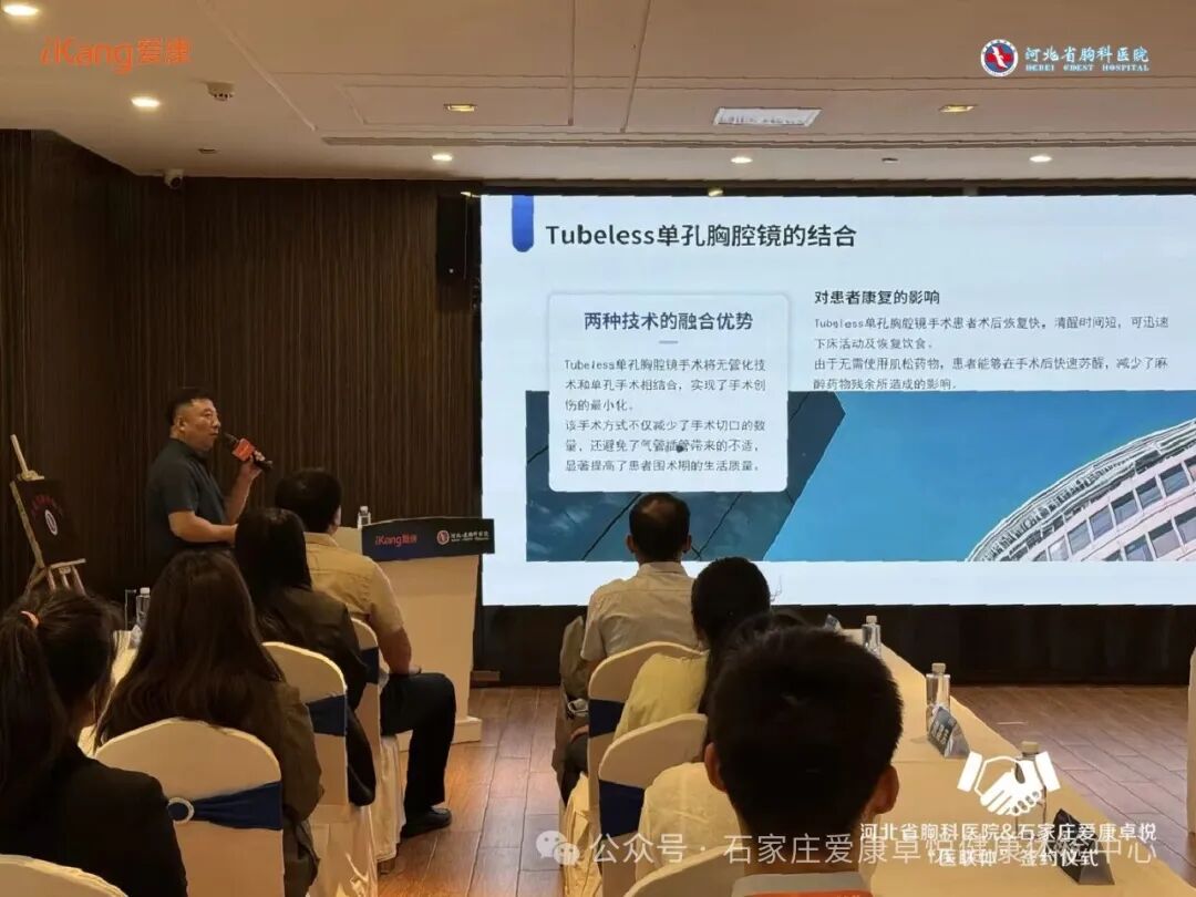签约揭牌仪式后,河北省胸科医院胸外科主任贺延法就《Tubeless单孔胸腔镜技术》进行了专题分享。