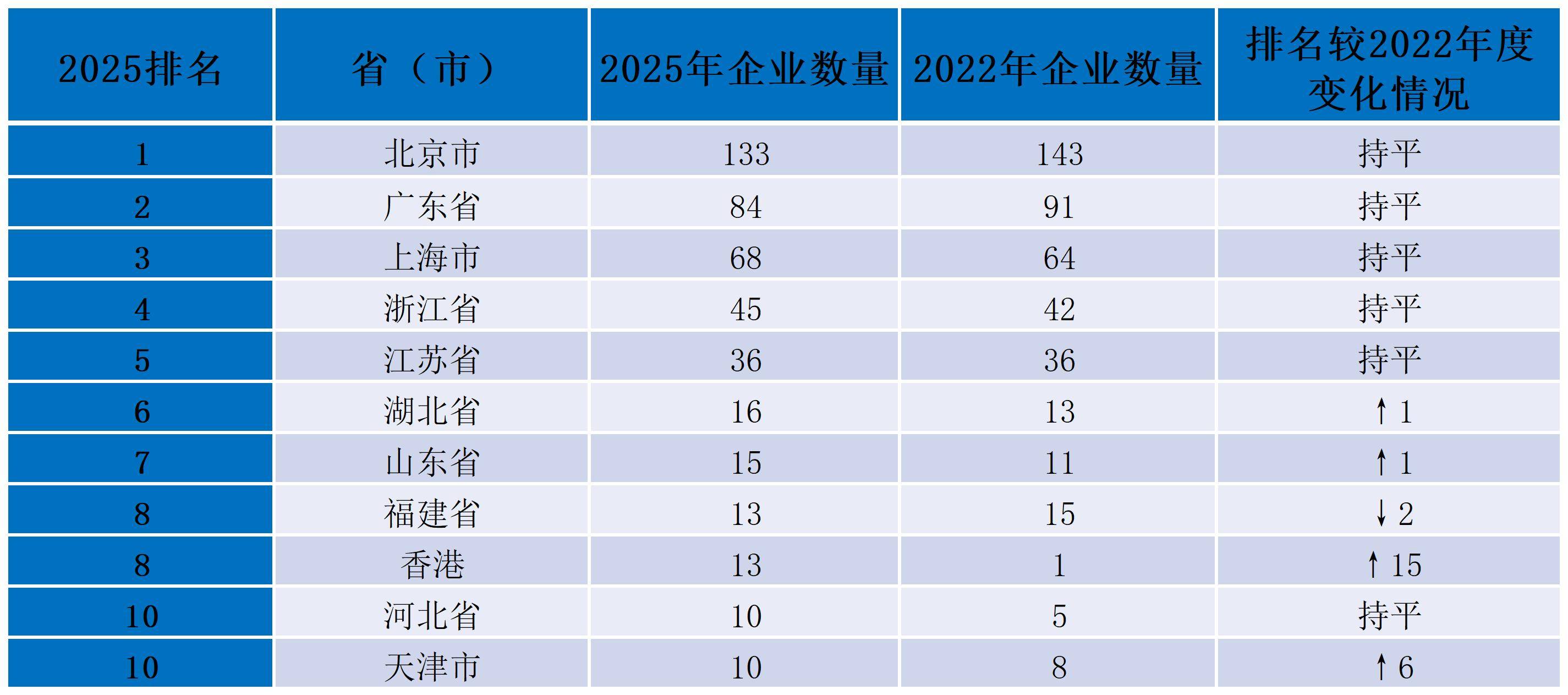 从行业角度看,电子信息制造业领域上榜企业数量增加最多,互联网平台企业上榜数量降幅最大。生成式AI技术正深度重构电子信息制造业产业格局,企业规模与市场竞争力显著增强。电子信息制造业上榜企业由2022年的123家增加到2025年的131家,占全部榜单比重由2022年的24.6%提升至26.2%,是TOP500占比最多的子领域。而企业数量减少最多的领域是互联网平台行业,由2022年榜单的39家减少到24家,降幅近40%,这是“流量红利”已进入瓶颈期及资本市场更趋理性共同作用的结果。