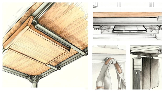 更让人惊喜的是配件的模块化设计。桌架暗藏的附件安装轨道系统,如隐形的 “配件舞台” :理线夹让杂乱电源线瞬间隐形,抽屉模块从桌下滑出时毫无卡顿,主机架稳稳吊起沉重机箱,安装全程都无需打孔。所有部件模块化,像乐高积木,扩展超有趣!