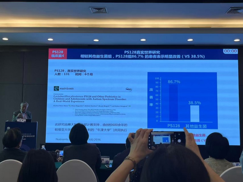 郑毅教授在报告中也介绍了情绪益生菌PS128的临床研究。在一项针对抑郁症患者的人体临床研究显示,连续服用情绪益生菌PS128八周后,受试者在汉密尔顿抑郁量表(HAMD-17)中的得分显著改善,抑郁严重程度降至基线水平的50%。另一项在意大利实施的真实世界研究结果表明,在持续服用情绪益生菌PS128六个月后,有86.7%的儿童与青少年出现行为方面的明显改善,效果远优于其他益生菌对照组(38.5%)。种种数据证实了情绪益生菌PS128在真实世界中的良好成效。