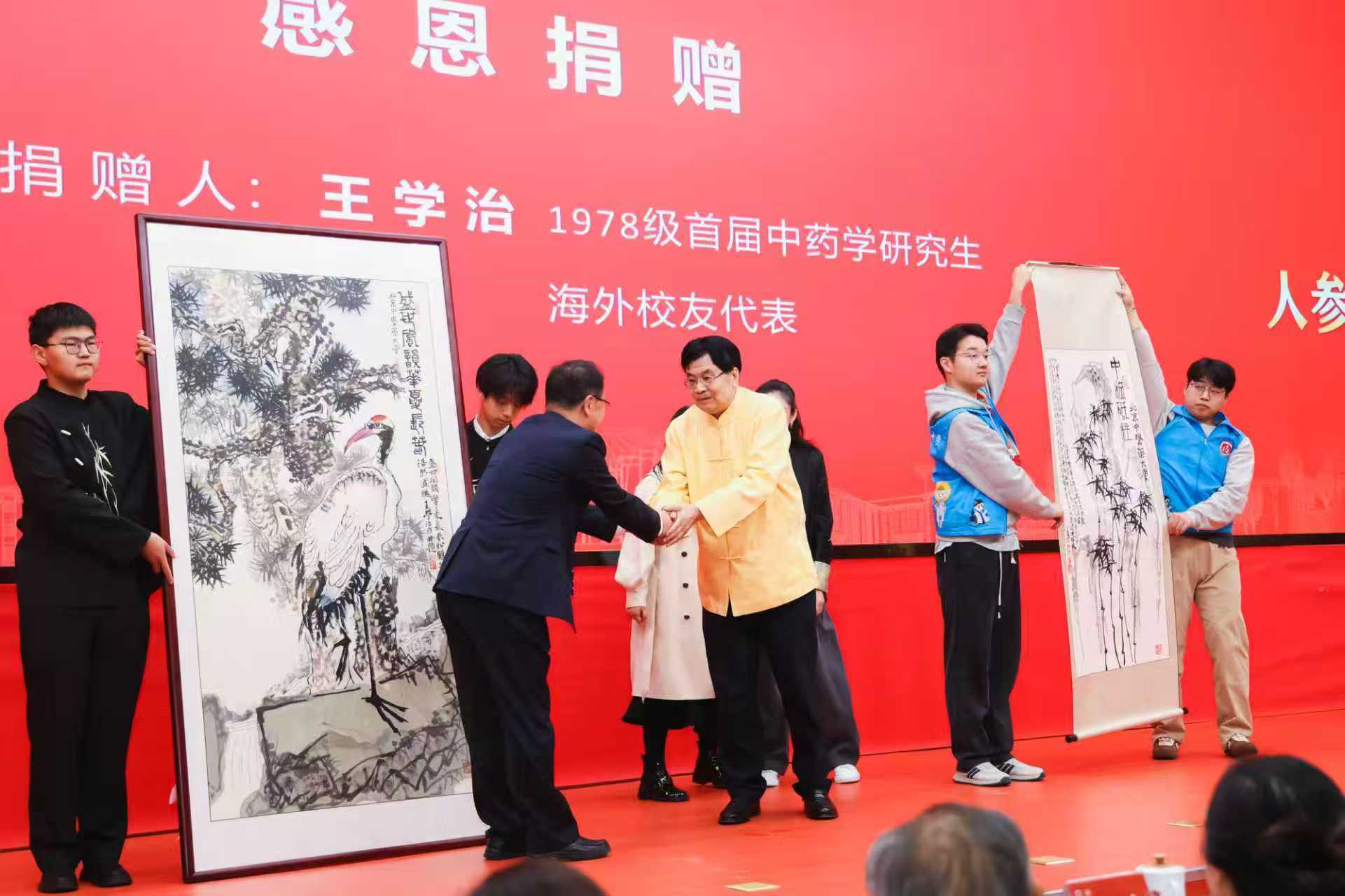 近日,北京中医药大学“2025年校友秩年返校大会暨建校70周年纪念活动,一周年启动仪式”隆重举行。作为该校1978级首届中药学研究生、旅美杰出校友的代表,王学治先生将两幅亲自创作的国画作品《盛世风韵》与《中流砥柱》,郑重捐赠予母校。随后,他与校党委书记王瑶琪、校长唐志书等校领导及师生代表一同,推动了象征着新征程开启的,推杆。金沙倾泻,华章新启,中医药事业的精神血脉薪火相传、历久弥新。