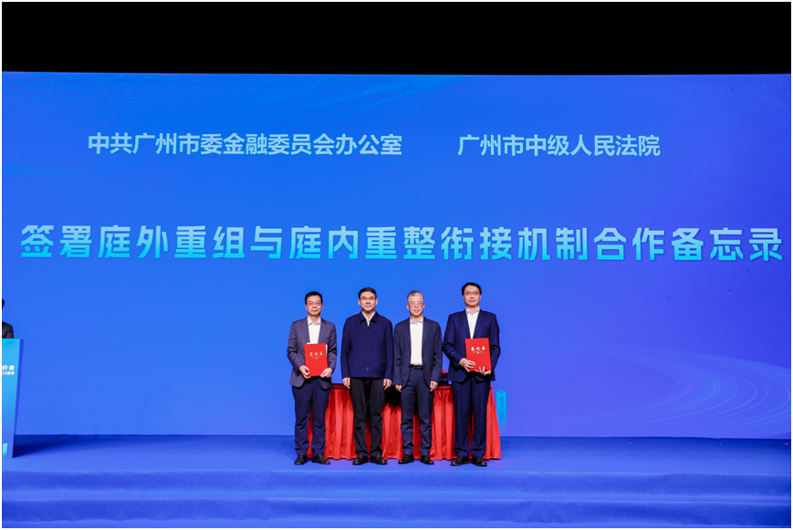 活动伊始,为落实省委“1310”工作部署与市委“1312”思路举措,推进国际一流法治化营商环境建设,构建庭内外重组衔接机制,中共广州市委金融委员会办公室与广州市中级人民法院共同签署了《关于构建庭外重组与庭内重整衔接机制的合作备忘录》,双方将围绕重组重整涉及的案件双向移送、快速审理、规范指导、材料移交、管理人推荐、优化财产处置渠道、交流共建、协同办公等方面,构建府院联动衔接机制,强化资源整合、流程协同与信息共享,为特殊资产处置提供更高效的司法保障与行政协同。