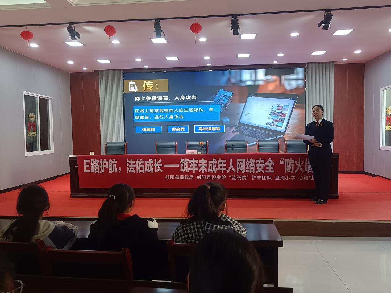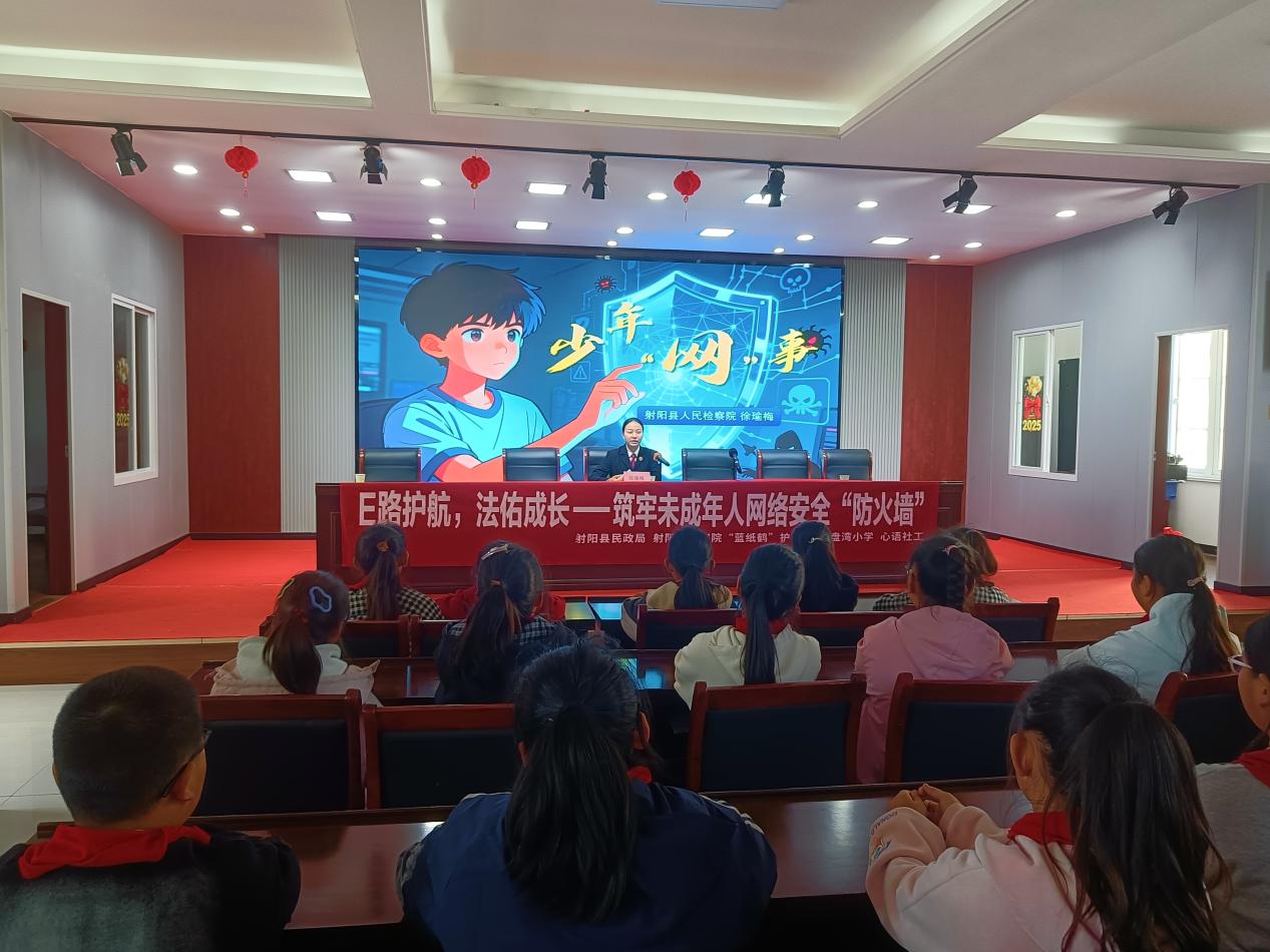 10月29日,一场以“E路护航,法佑成长”为主题的未成年人网络安全教育活动在射阳县盘湾小学生动开展。本次活动是射阳县探索构建 “民政牵头、检察护航、社工介入”三位一体未成年人保护工作模式的一次成功实践,彰显了多部门协同发力为少年儿童健康成长织密保护网的强大合力。