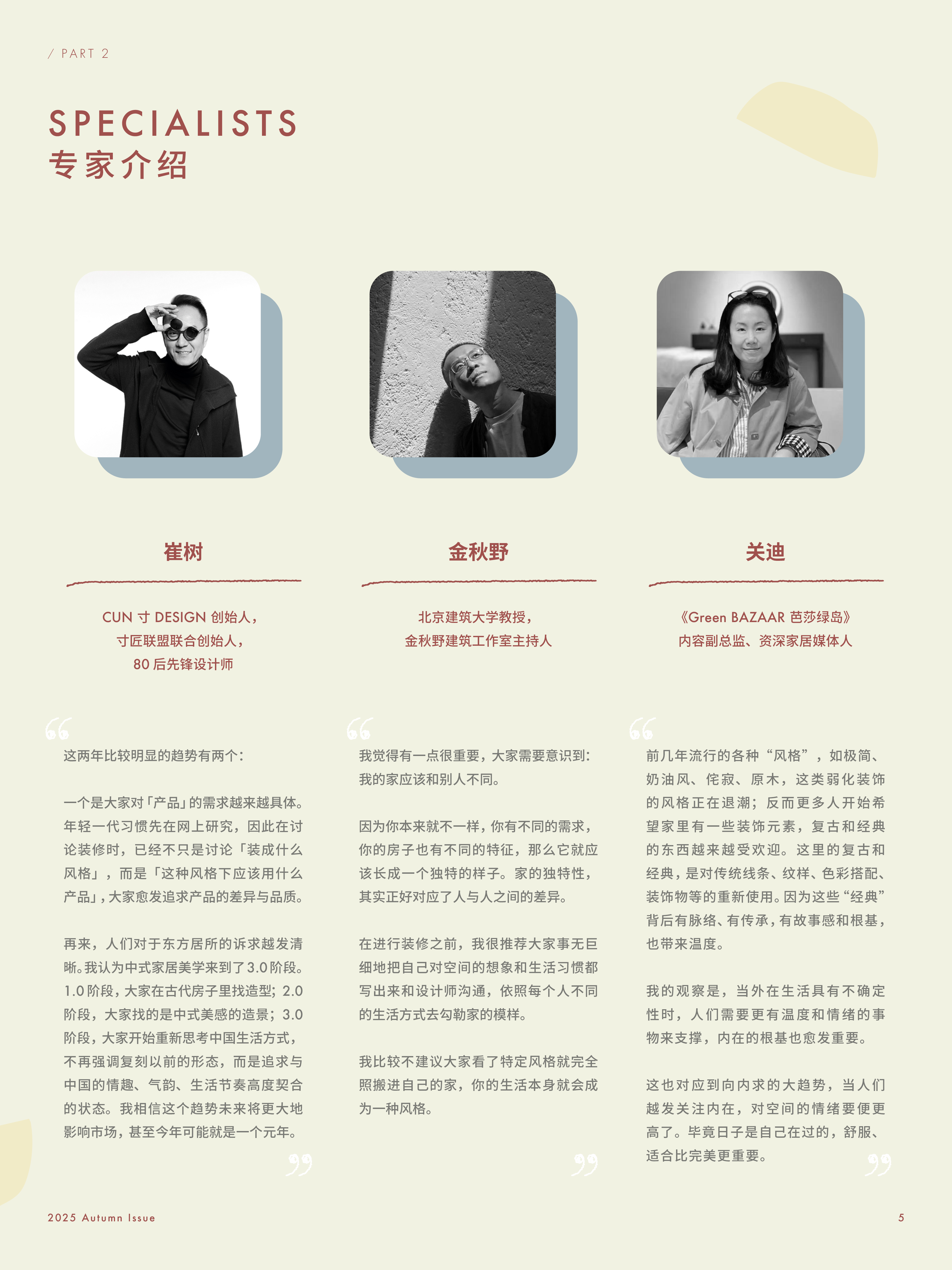 CUN寸design创始人、80后新锐设计师崔树则认为,当前中国居家美学已经进入了一个「重新思考中国生活方式」3.0阶段,家装人群力求在家寻找与中国式生活节奏、情趣、气韵更契合的状态。关迪女士进一步指出,这种对家的美学的重视,“呼应着「向内求」的大趋势”。