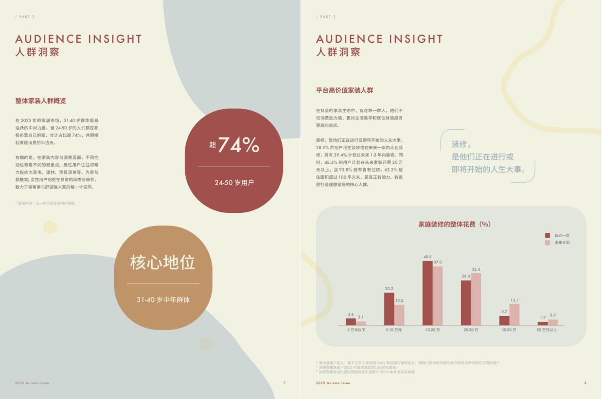在抖音,有着强烈“微迭代”意愿又有强消费能力的高价值家装人群,普遍对生活美学和居住体验感展现出了更高追求。在他们看来,家装家居之“美”,不仅在于高颜值,更在于足够美丽的功能实用性——近6成用户表示,如何能够美美解决“家场景”下的生活痛点,其决策优先级,远高于价格优惠因素。同时数据显示,在各种看起来不够美的家居生活痛点选项中,位列前三的,分别是「缺乏智能化支持」、「缺乏贴合的空间规划」以及「不够合理的收纳设计」。这也为各大品牌沟通爱美家装人群提供了方向性参考。