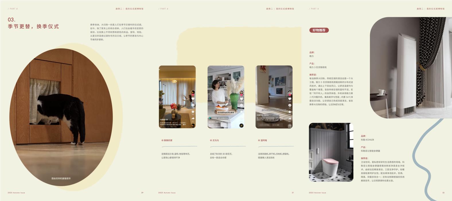 还有每逢季节更替时收纳扫除的换季仪式感,在家务之外,换季也是家居重新布置和焕新改扮的绝佳时点;造型美观又能深度清洁的格力3匹京致柜机、KOHLER科勒芸沁智能坐便器等热门产品,则为这类场景下的仪式感营造提供了灵感。