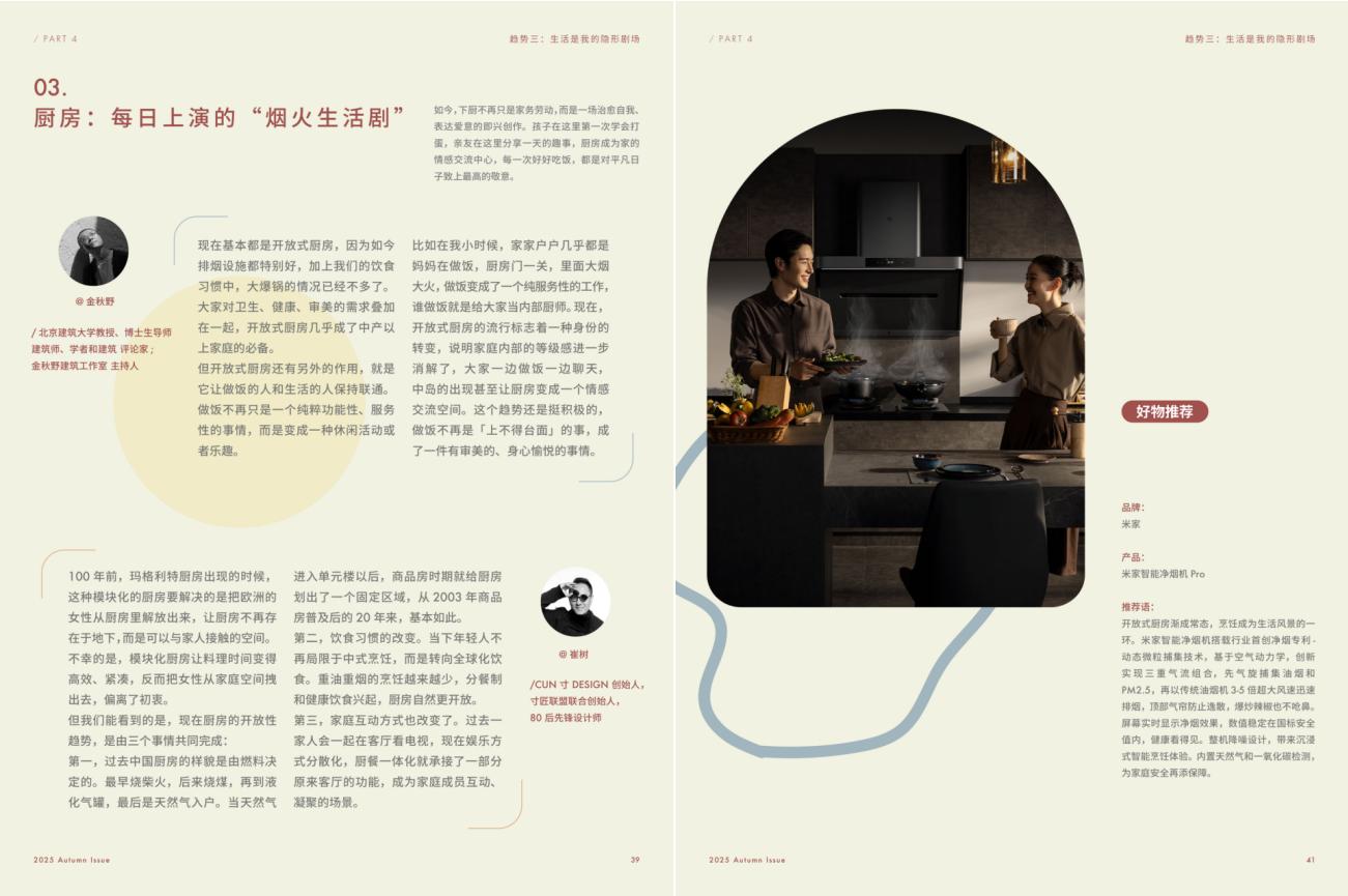 各色贴近自然质感或大地色系的家具材料和风格应用,则让居家剧场的布景更具张力。开放式厨房的进一步普及,也让家庭成员每日共同上演的烟火生活更具现场感、交互性和感染力,米家智能净烟机Pro等趋势产品更进一步强化了在这座“剧场”里的沉浸式演出体验。