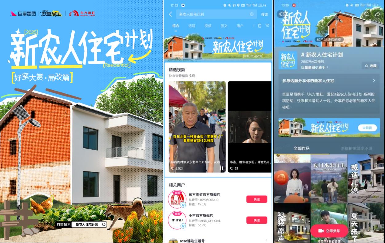在“家空间”方面,巨量星图发起的空间趋势IP「好室大赏」,此前已针对新农人住宅、城市老破小改造、厨房新范式等多个住宅空间趋势进行即时洞察并打造影响力吸睛案例,如“新农人住宅计划”合作东方雨虹,回乡改造新农人老房的实况内容短时间迅速引爆。近段时间「好室大赏」IP将继续聚焦空间“局改”议题,通过官媒联合发声、屋主装修vlog、达人探访的资源组合拳,助力更多家居家装品牌实现场景和人群的破圈种草。