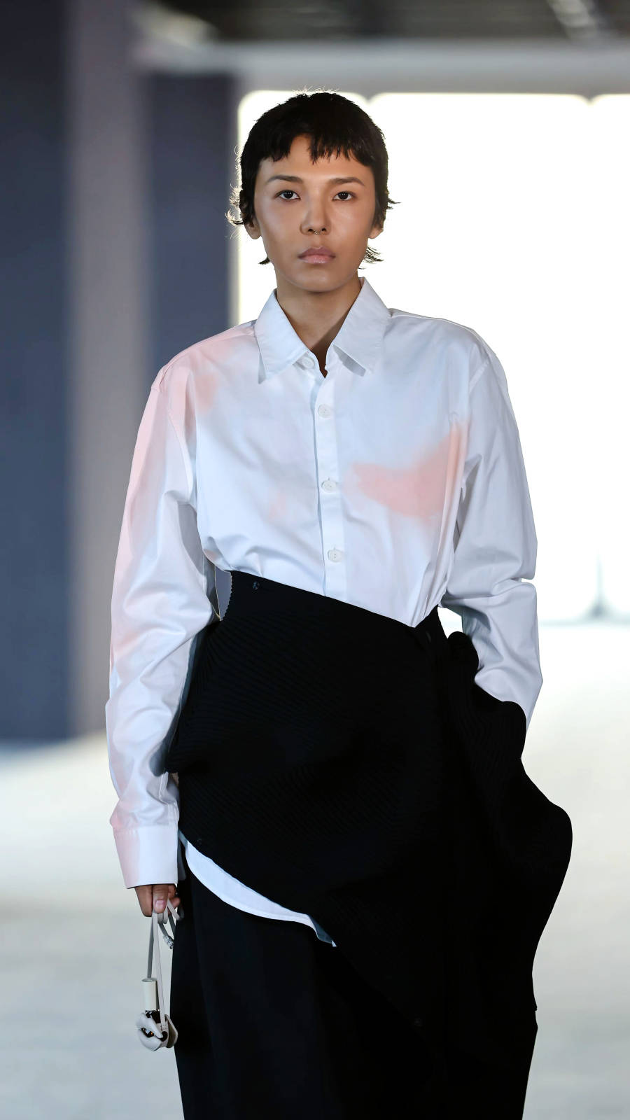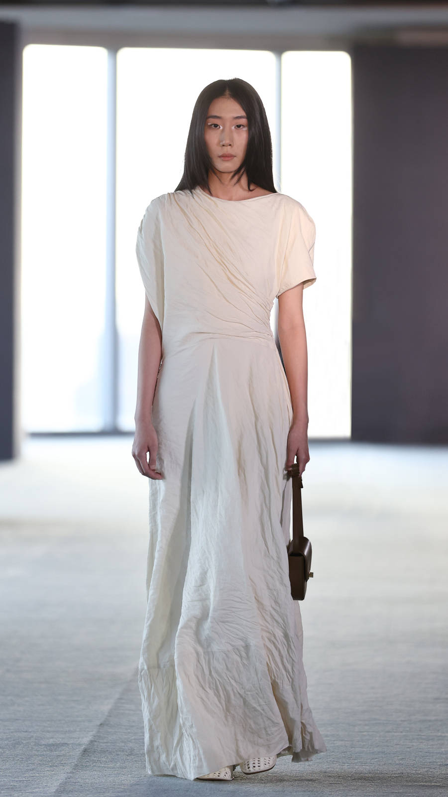 JUDYHUA延续“软雕塑”艺术基因,通过立体斜裁、不对称剪裁与解构手法,打破服装的二维边界,塑造出极具空间感的流动廓形。这些廓形不只是物理性的,更是心理性的——我们存放记忆、情感与经历的容器。