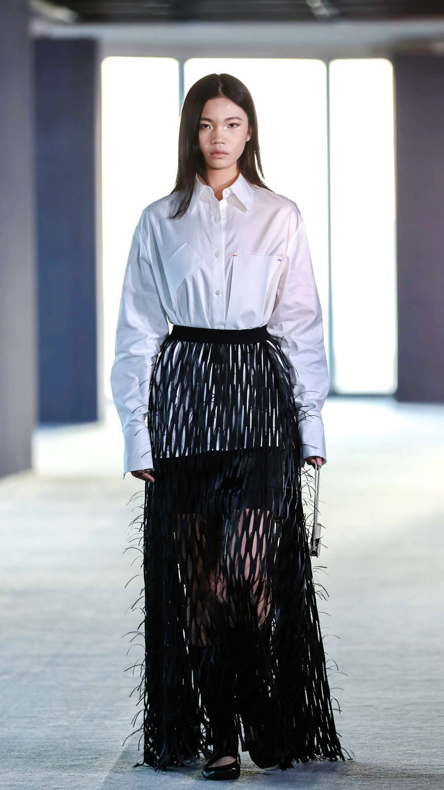 T台上,模特走秀的身影与鳞次栉比的摩天大楼光影交错,映衬出些许超现实主义的流动感。廓形随灯光与模特步伐流动,时间在空间中缓缓延展。观众仿佛置身于服装与艺术交错的场域,感受每件作品中承载的记忆与情感。