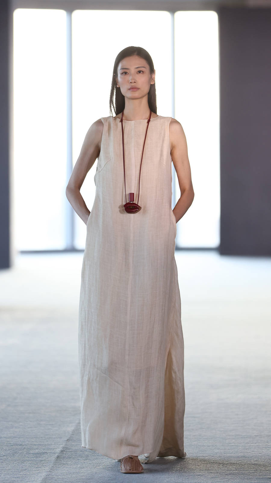 本季特别融入艺术家常玉手绘的抽象裸女线条,简约而富有呼吸感的笔触在面料起伏间若隐若现,随身体的律动流动,呈现人体生命力与时间交织的互动,形成身体与服装、瞬间与永恒的视觉对话。