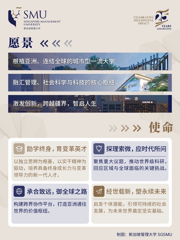 2000年,新加坡管理大学(简称:新大)的创立源于一个深刻的时代洞察:21世纪知识与商业经济的崛起,亟需全新的人才培养模式。作为新加坡第三所公立大学,新大承载着国家对商业与管理教育创新发展的战略期待。创校伊始,新大就展现出与众不同的办学特色,选择了在本地高校间一条前所未有的道路:以美国常春藤名校宾夕法尼亚大学沃顿商学院为蓝本,推动新大成为亚太地区少数具备美国顶尖大学办学特色的高等学府之一。