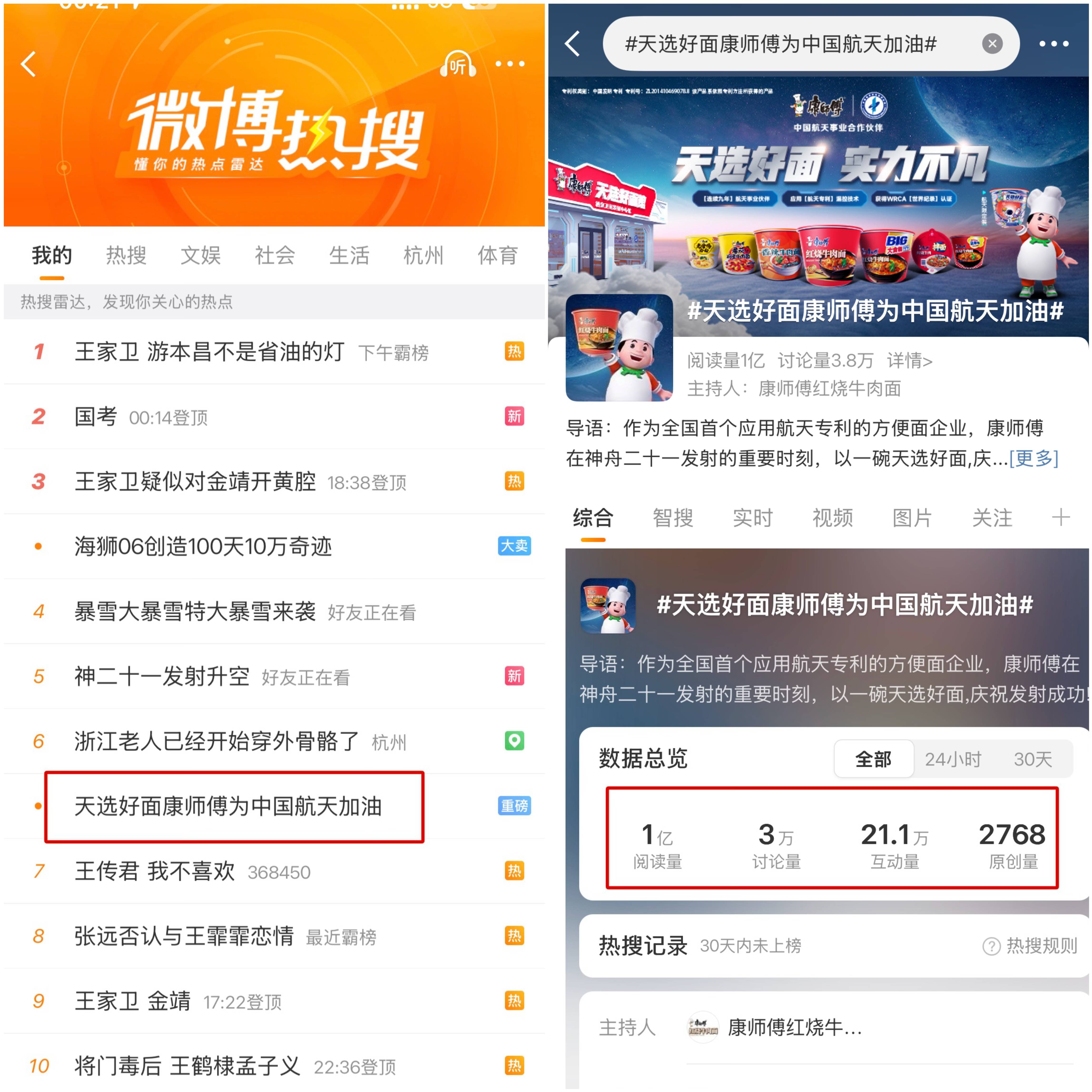 此外,网红大 V 何同学与毕导惊喜现身这次活动,为这碗好面加油打气,进一步掀起现场人潮涌动,带动微博相关话题“#天选好面康师傅为神舟二十一加油”登上热搜,成功引爆关注热潮。