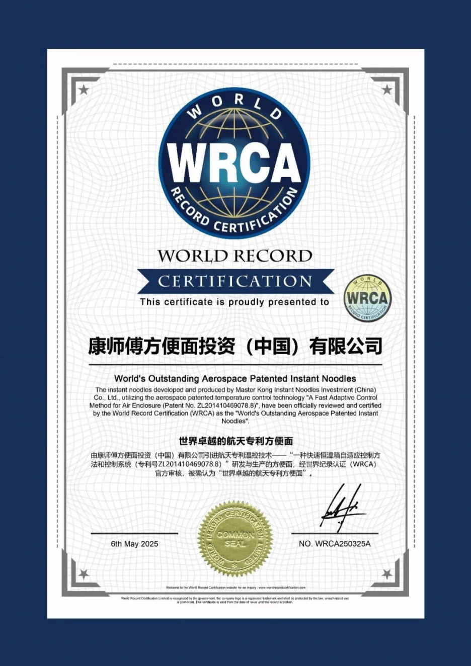 这种认可并非口头上的赞许,而是落在了技术层面。双方共同推动的“航天专利温控技术”,已在康师傅生产线上全面落地。今年5月,这项技术获得世界纪录认证机构(WRCA)的全球纪录认证,成为这一科技实力的又一次外部印证。