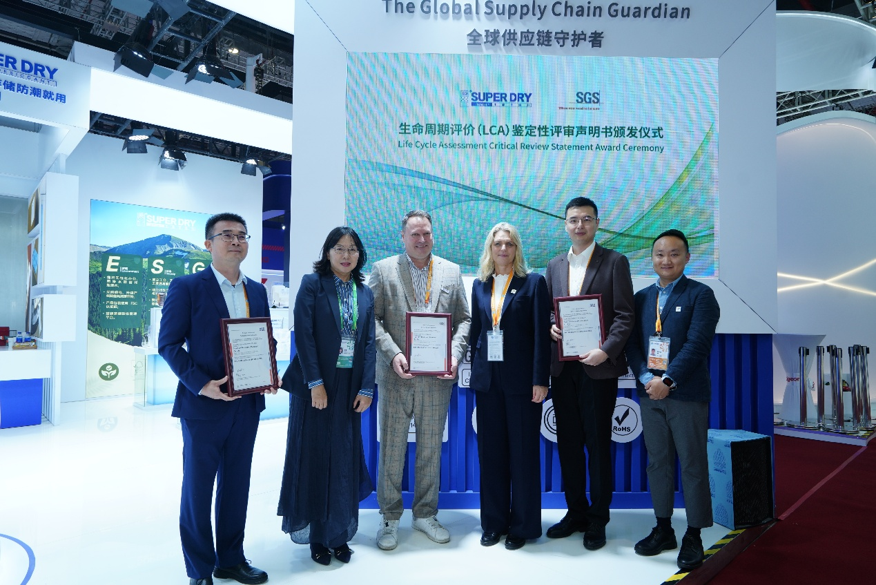 11月6日,在第八届中国国际进口博览会现场,干霸干燥剂(深圳)有限公司(以下简称“SUPER DRY”)隆重举行了旗下三款核心干燥剂产品的生命周期评价(LCA)鉴定性评审声明书颁证仪式。该声明由国际公认的测试、检验和认证机构SGS颁发,涵盖 SUPER DRY 氯化钙干燥剂、INCUBIC 硅胶干燥剂与 INCUBIC 矿物干燥剂,标志着 SUPER DRY 在产品全生命周期环境管理方面迈出关键一步。