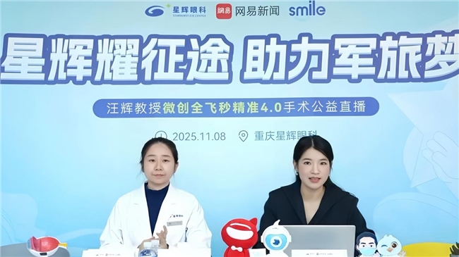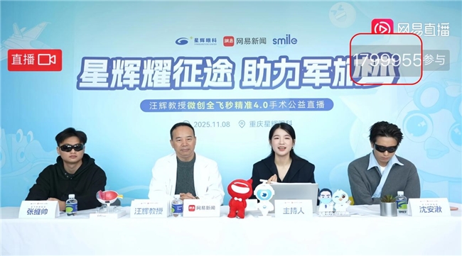 2025年11月8日,由星辉眼科、网易新闻、德国蔡司全飞秒联合呈现的“星辉耀征途 助力军旅梦”——汪辉教授微创全飞秒精准4.0近视手术大型公益直播圆满落幕。本次直播通过全程实景呈现与专业讲解相结合的形式,为观众带来了一场既直观又严谨的眼健康科普盛宴,整场直播共吸引近200万人次观看。