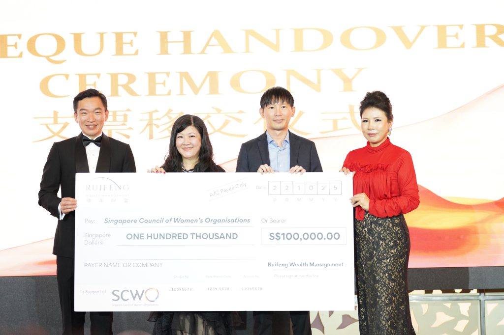 瑞丰财富向SCWO捐赠10万新元以支持女性项目,左起: 蔡瑞隆 ,王素真, 黄泽宁 以及宋娓(图源:时代财智)