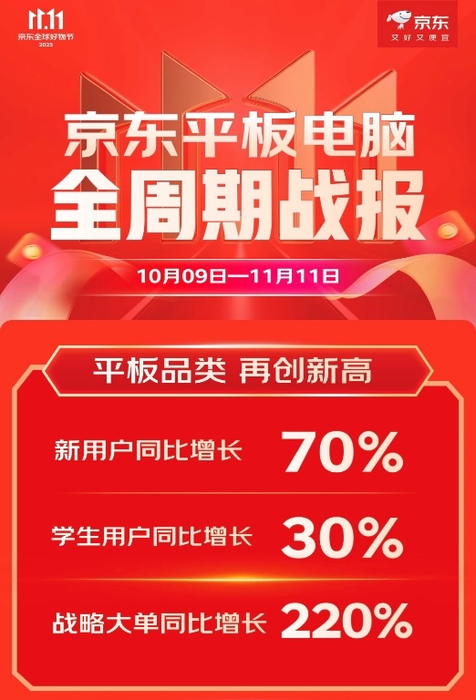 京东11.11期间,平板电脑实现新用户同比增长70%。其中,借助规模化采购带给用户超省价格的平板电脑战略大单业务同比增长220%,办公平板与游戏平板分别实现成交额同比150%和110%的快速增长。
