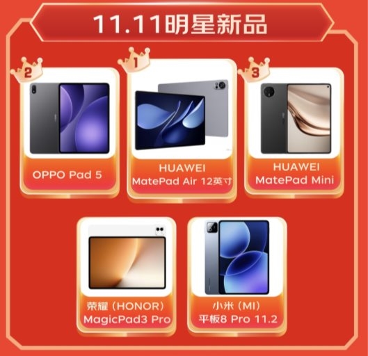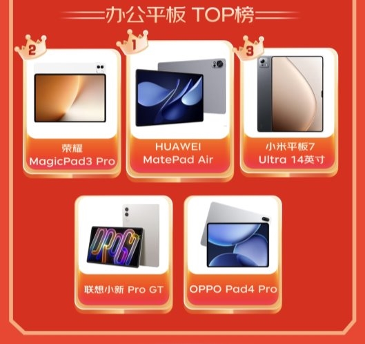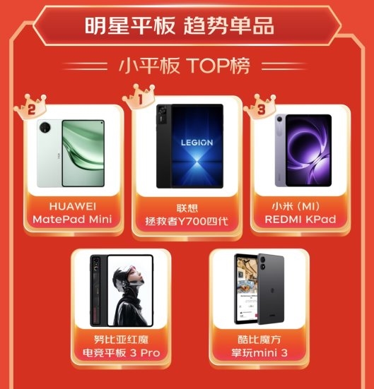 在明星平板趋势单品领域,小平板成为最大亮点。联想拯救者Y700四代、华为MatePad Mini、小米REDMI KPad位列该品类前三甲。而在移动办公场景中,华为MatePad Air、荣耀MagicPad3 Pro、小米平板7 Ultra 14英寸备受职场人士青睐。