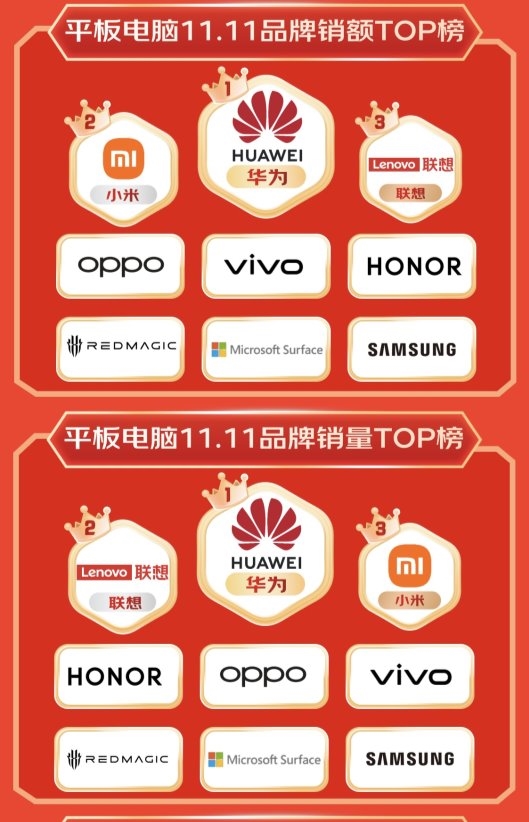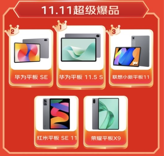 从整体品牌销额看,华为、小米、联想在平板销额榜上名列前茅,华为、联想、小米则领跑销量榜单。产品创新持续推动市场发展,华为平板11.5S、华为平板SE、联想小新平板11成为本届超级爆品。