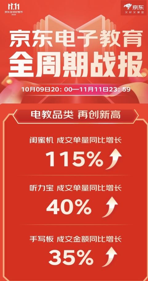 依托超级供应链的坚实基础和支撑,本届京东11.11整体成交额再创新高,下单用户数同比增长40%,订单量增长近60%,以“又好又便宜”的商品与服务体验,推动多业务线实现高质量增长。其中,凭借使用的便捷性和高效性的多重优势,京东平板电脑和电子教育品类双双迎来突破性增长,办公平板、游戏平板、闺蜜机、听力宝等趋势品类表现亮眼,展现出消费市场蓬勃的活力。