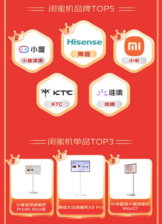 在新兴的闺蜜机品类中,海信、小度添添、小米占据品牌领先地位,海信大白闺蜜机X8 Pro、小度添添闺蜜机Pro4K Max版、小米超级小爱闺蜜机Max27深受家庭用户欢迎。