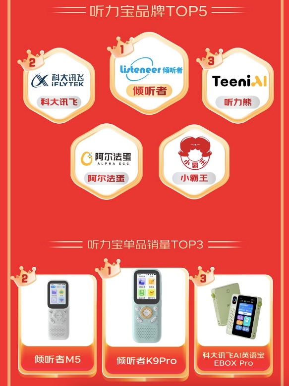 其他智能学习设备同样表现不俗。录音笔市场由科大讯飞、纽曼、出门问问主导;听力宝领域倾听者、科大讯飞、听力熊位居品牌前三,倾听者K9Pro、M5、科大讯飞AI英语宝EBOX Pro成为热销单品。