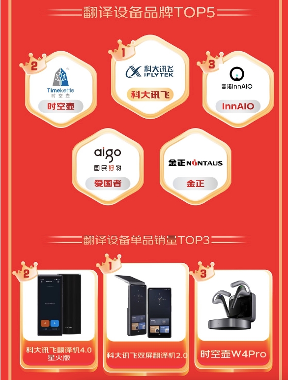 翻译设备市场则呈现科大讯飞、时空壶、InnAIO三强鼎力格局,科大讯飞双屏翻译机2.0、翻译机4.0星火版、时空壶W4Pro登顶单品销量榜。