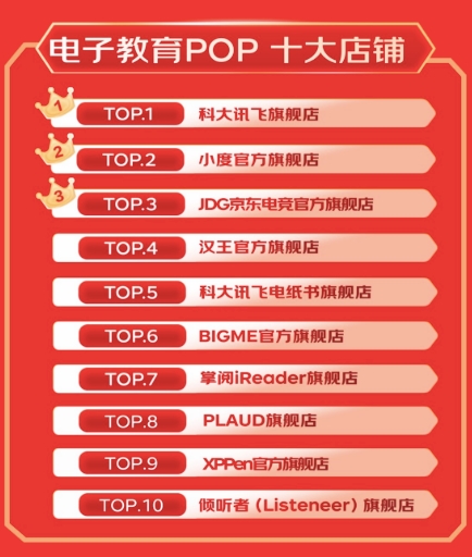 在手写板市场,由Wacom、高漫、XPPen领跑前三甲。整体来看,电子教育POP店铺中,科大讯飞旗舰店、小度官方旗舰店、JDG京东电竞官方旗舰店销售表现优异稳稳占据前三名。