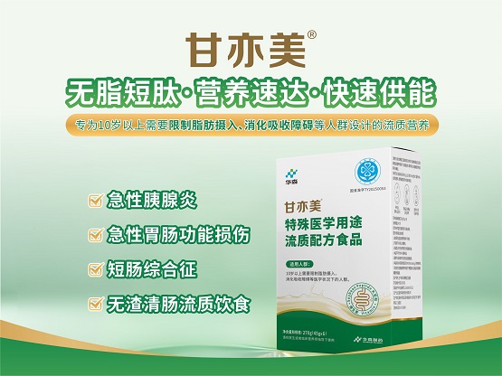 据介绍,本次获批的甘亦美®特殊医学用途流质配方食品,是一款专为10岁以上需严格限制脂肪、消化吸收障碍等患者研发的特医食品。其采用0脂肪、0纤维、主以碳水、辅以短肽的科学配方,碳水化合物供能比高达87%,能快速供能且无消化负担,易于吸收。同时添加核心维生素与矿物质,保障营养均衡、电解质平衡。适用于急性胰腺炎、短肠综合征、胃肠功能损伤等疾病状态的营养支持,亦可作为结肠镜检查前标准化的清肠流质饮食,以提高肠道准备质量。