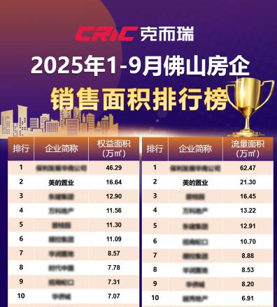 这份“扎马步”的稳劲,早在2004年便有印证。当年美的置业君兰高尔夫生活村落地,以自建高尔夫俱乐部、商务中心等高端配套,既圆了广佛精英的宜居梦,更开启佛山高端住宅先河。此后,美的云悦江山、滨江壹号等项目接续落地,精准匹配改善需求。截至目前,美的置业粤桂公司在佛山开发项目超 50个。克而瑞数据显示,2025年1-9月,该公司在佛山区域权益面积与流量面积均位列佛山房企销售榜第二位。这份实打实的成绩,正是美的置业粤桂公司“马步”之稳的生动注脚。