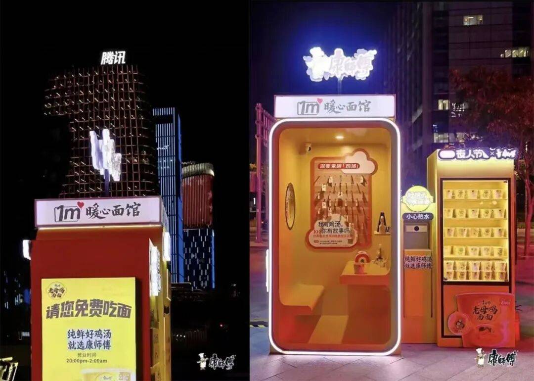 焕新的老母鸡汤面,继续主打“温情”陪伴。前段时间,康师傅“1平米面馆”出现在上海、杭州、深圳等地街头,犹如现实版的深夜食堂,用一碗热腾腾的老母鸡汤面,抚慰了无数人疲累的灵魂。