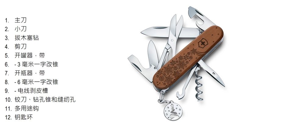 2025 攀登者冬季魔力限量版瑞士军刀配备 12 项精心设计的实用功能,以卓越的耐用性与可靠性为核心理念打造。具体功能如下: