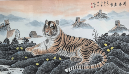 《卧虎藏龙》 以工笔绘虎、写意挥洒山水,并结合界画技法勾勒长城,通过“明虎暗龙”的意象对比,寄寓神龙护佑、国泰民安之愿,是一件融多种技法与深厚寓意于一体的综合性巨制;
