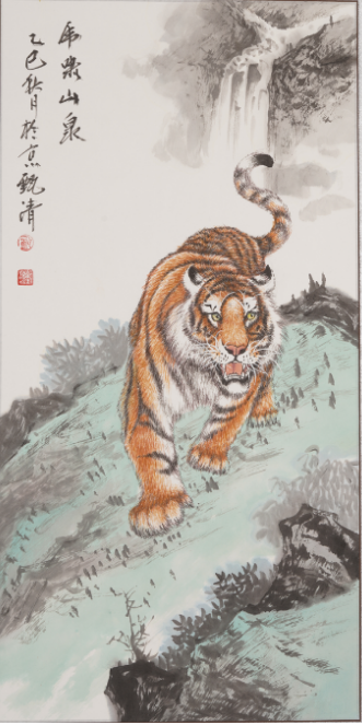 甄清,号慕寅草堂主人,深耕绘事数十载,融工笔之精微与写意之磅礴于一体,在承续中国画传统笔墨精神的基础上,勇探新境,形成了独具个人风格的“甄氏虎画”体系。其笔下之虎,无论是下山之势、上山之威,亦或长啸山林之霸,皆形神兼备,不仅是艺术技法的凝练,更是时代精神与人文情怀的深刻写照。