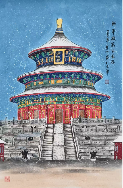 在《祈年殿万古长存》中,韩荣洲以“苍润兼备、雄秀相合”的典型风格,将祈年殿这一经典文化地标置于充满诗意的山水语境中。作品不仅精准捕捉了古建筑的庄严形制,更通过层次丰富的笔墨语言,赋予其“万古长存”的精神寓意,体现出艺术家对传统文脉的当代诠释与视觉重构。