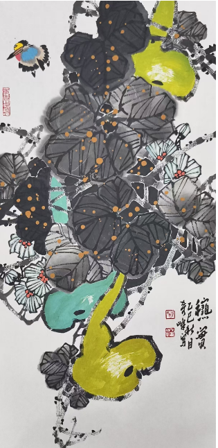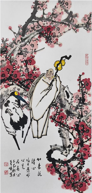 《红梅罗汉》为顾奇峰新禅意画的代表之作。作品将写意红梅与罗汉形象并置,以梅枝的纵横结构与花蕾的疏密节奏,呼应罗汉高洁孤傲的精神气质,实现“花中有禅、禅中见境”的美学融合。该作延续了艺术家“以禅心作画,以画修禅”的创作理念,在色彩运用、构图意趣与意境营造方面均体现出其对南宗笔法与当代视觉构成的深度探索。